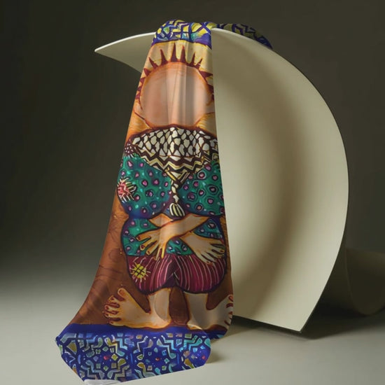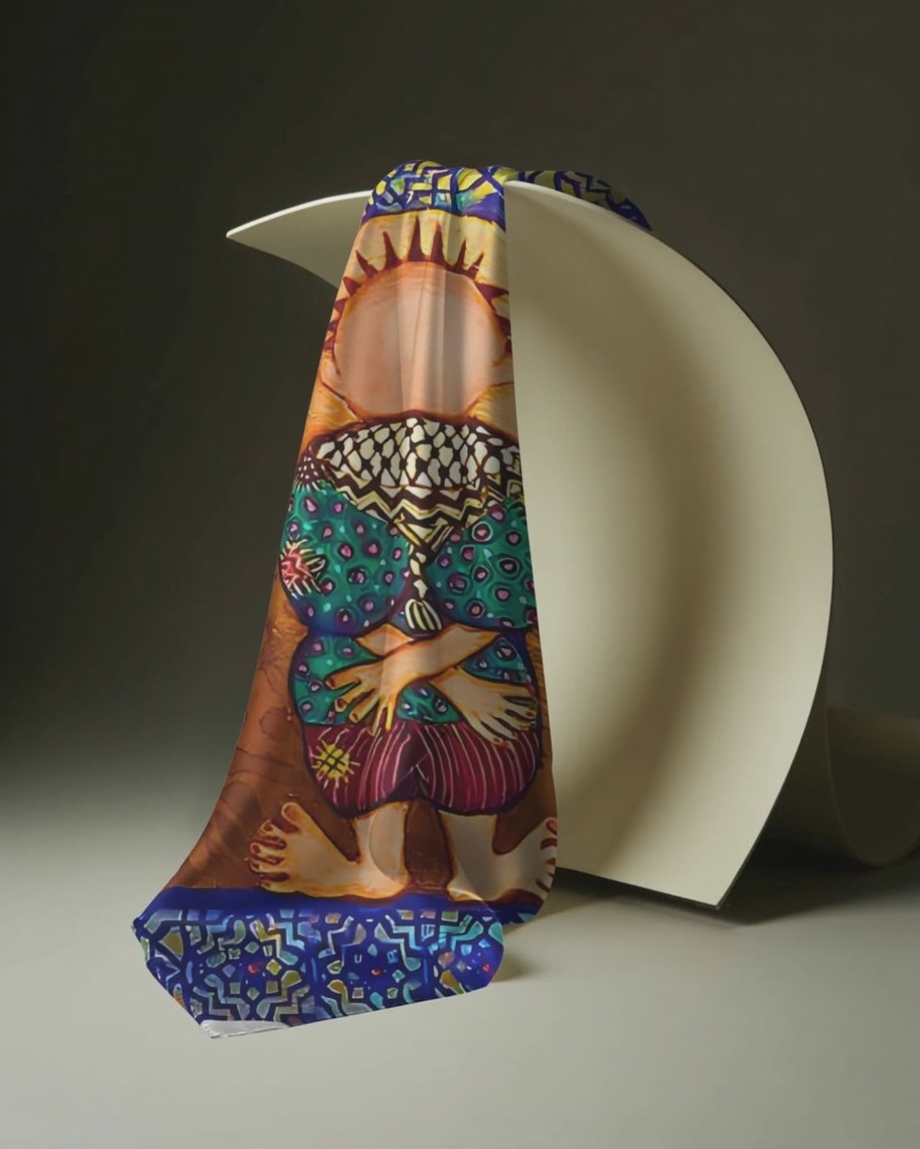 A masterpiece of conscience and color, now wearable. This exquisite scarf translates Laila Shawa’s powerful original artwork, "Handalah and the Summer," onto a canvas of pure, fluid silk. In this vibrant and deeply moving piece, Shawa embraces Handalah—the iconic symbol of Palestinian defiance—and clothes him in the brilliant patterns of summer, creating a profound juxtaposition of resilience and life. This is not just a scarf; it is a piece of art history, a conversation starter, and a tribute to a voice that could not be silenced.