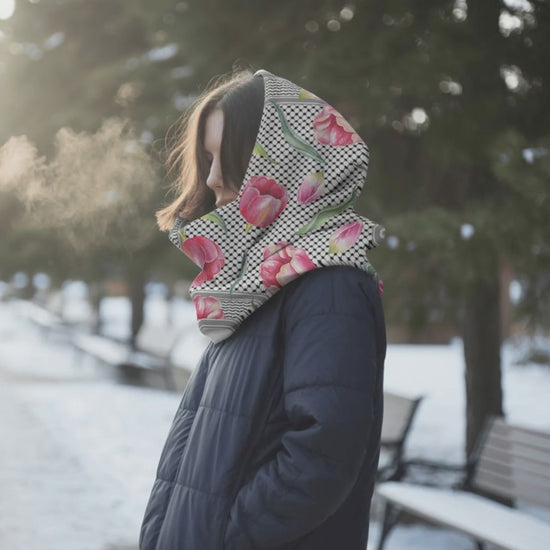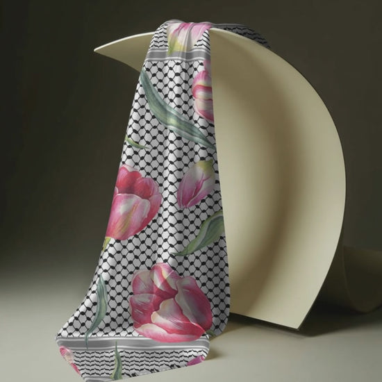 A gentle dialogue between nature and heritage, woven in pure silk. This original Gifting Spree design is where the soft whisper of the tulip finds a home within the iconic Palestinian kuffiyeh. In a graceful and intricate pattern, the delicate tulip—a timeless symbol of love and paradise—intertwines with the enduring strength of the kuffiyeh. This piece is a testament to new interpretations, a wearable poem that honors a legacy while blooming with its own unique identity.