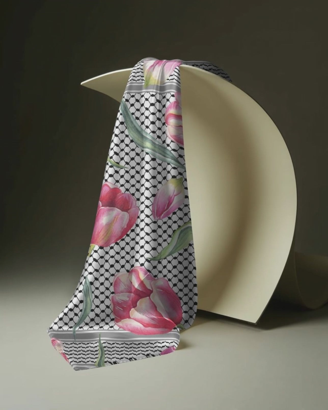 • The Kuffiyeh: An unmistakable symbol of Palestinian identity and unity, the net-like pattern provides a powerful and historic canvas for the tulips to bloom upon.